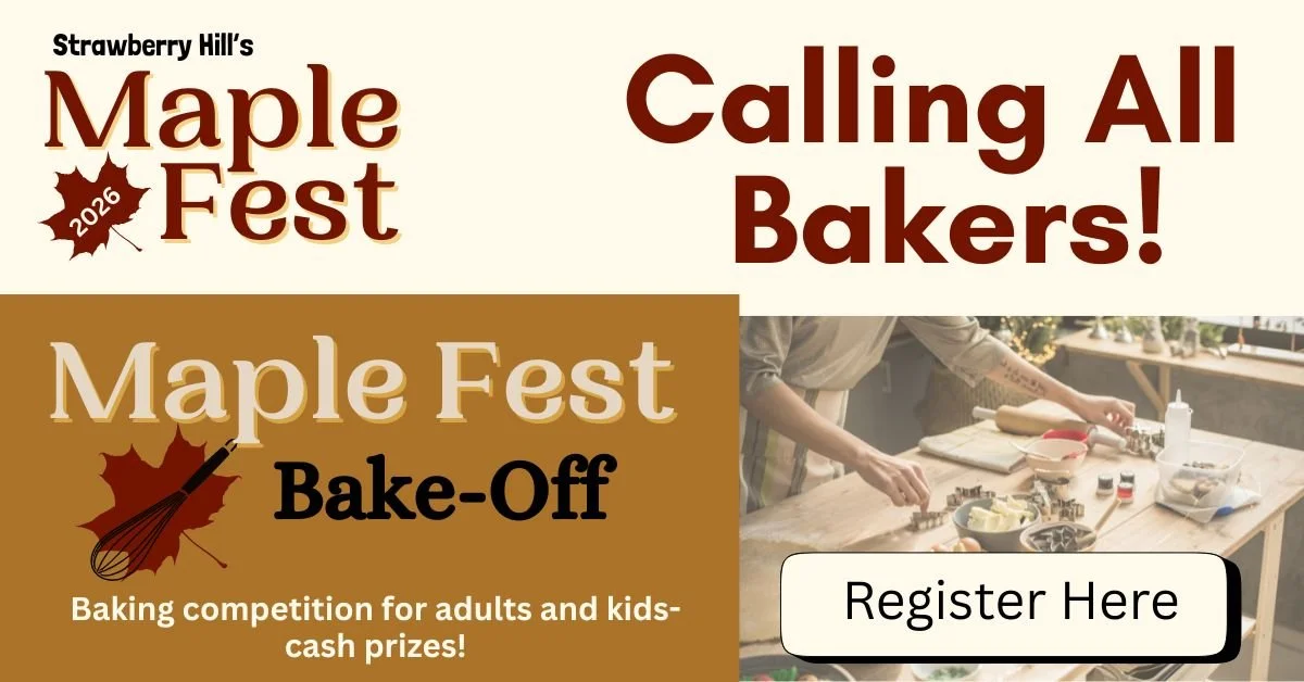 Welcome to Strawberry Hill's 2nd annual Maple Fest Bake-Off! The Strawberry Hill Maple Bake-Off Competition will be held on Saturday, February 28th, 2026 during Maple Fest at Camp Eder. Electronic entry forms must be submitted by 5 PM on Thursday, February 26th. Baked entries must be delivered to Camp Eder between 8:00 AM and 9:30 AM on Saturday, February 28th. Judging will occur at 10:30 AM. The winner will be announced at 11 AM. All entries must be homemade baked (not store-bought), non-refrigerated, and include maple as a main ingredient or component. Get creative with your baked goods!